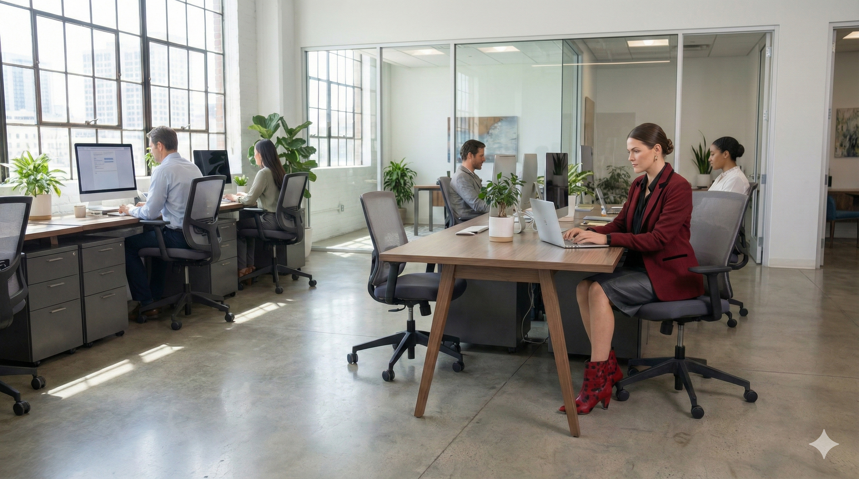 A contemporary workspace combining professionalism and personal flair in a spacious, sunlit office.