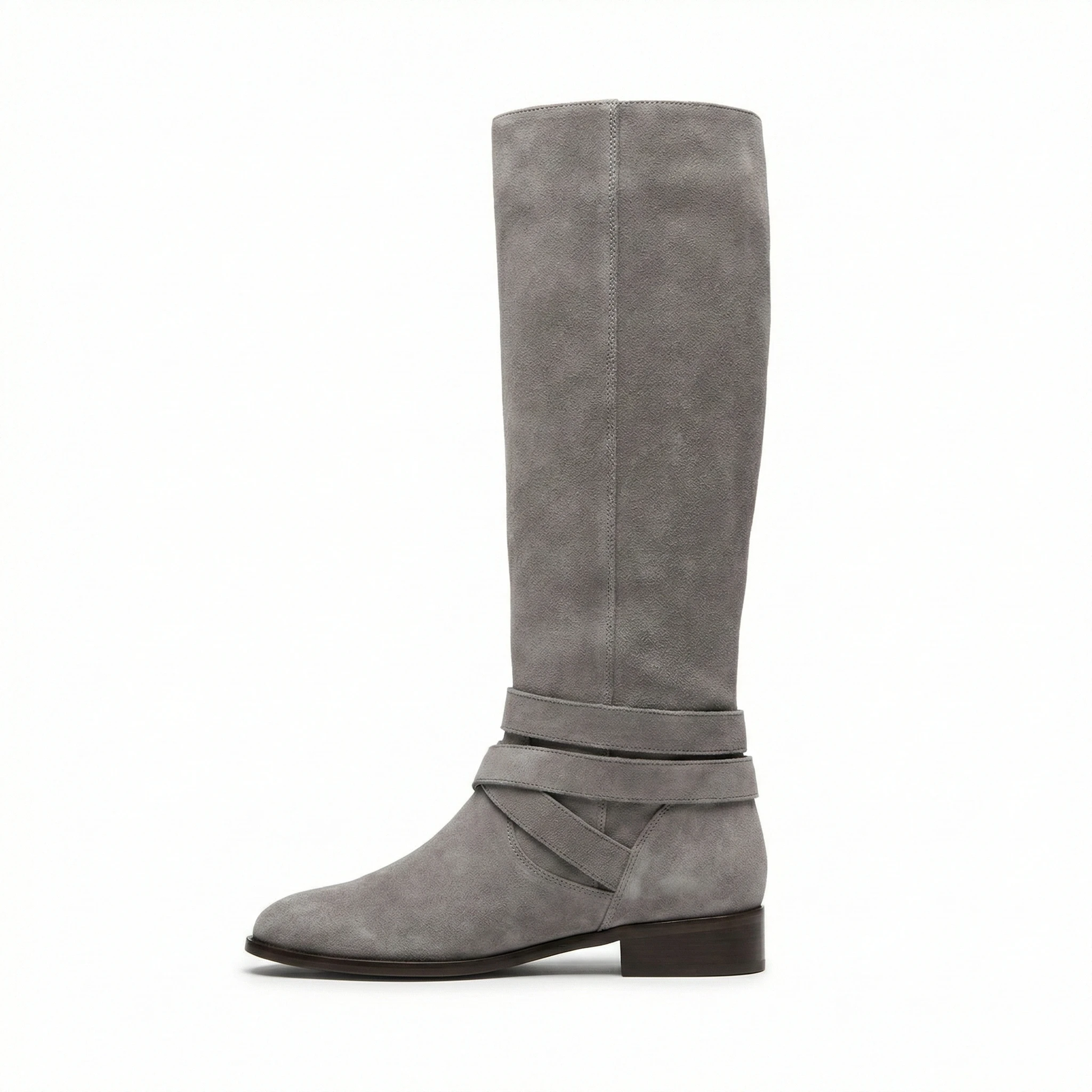Grey Suede Knee-High Boots - Handcrafted Strapped Long Boots