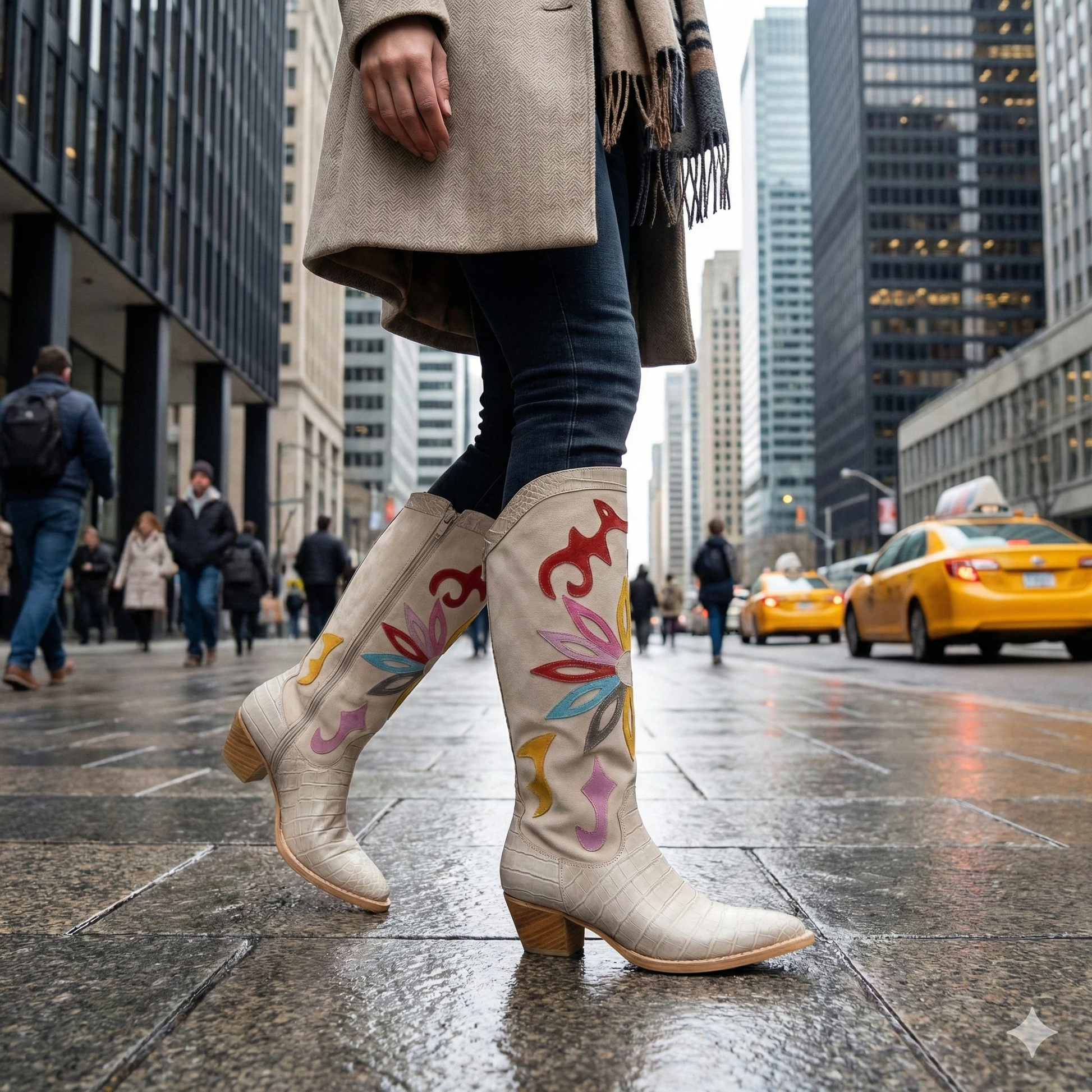Step into a world where traditional craftsmanship meets modern bohemian luxury. These knee-high Western boots are designed for the woman who views her footwear as a canvas of self-expression. Every step radiates confidence thanks to the striking contrast between the exotic croco-leather texture and the whimsical, hand-applied colorful accents. Whether you are strolling through an art gallery or heading to a high-end festival, these boots serve as the ultimate statement piece, offering a perfect blend of "Wild West" spirit and urban sophistication.