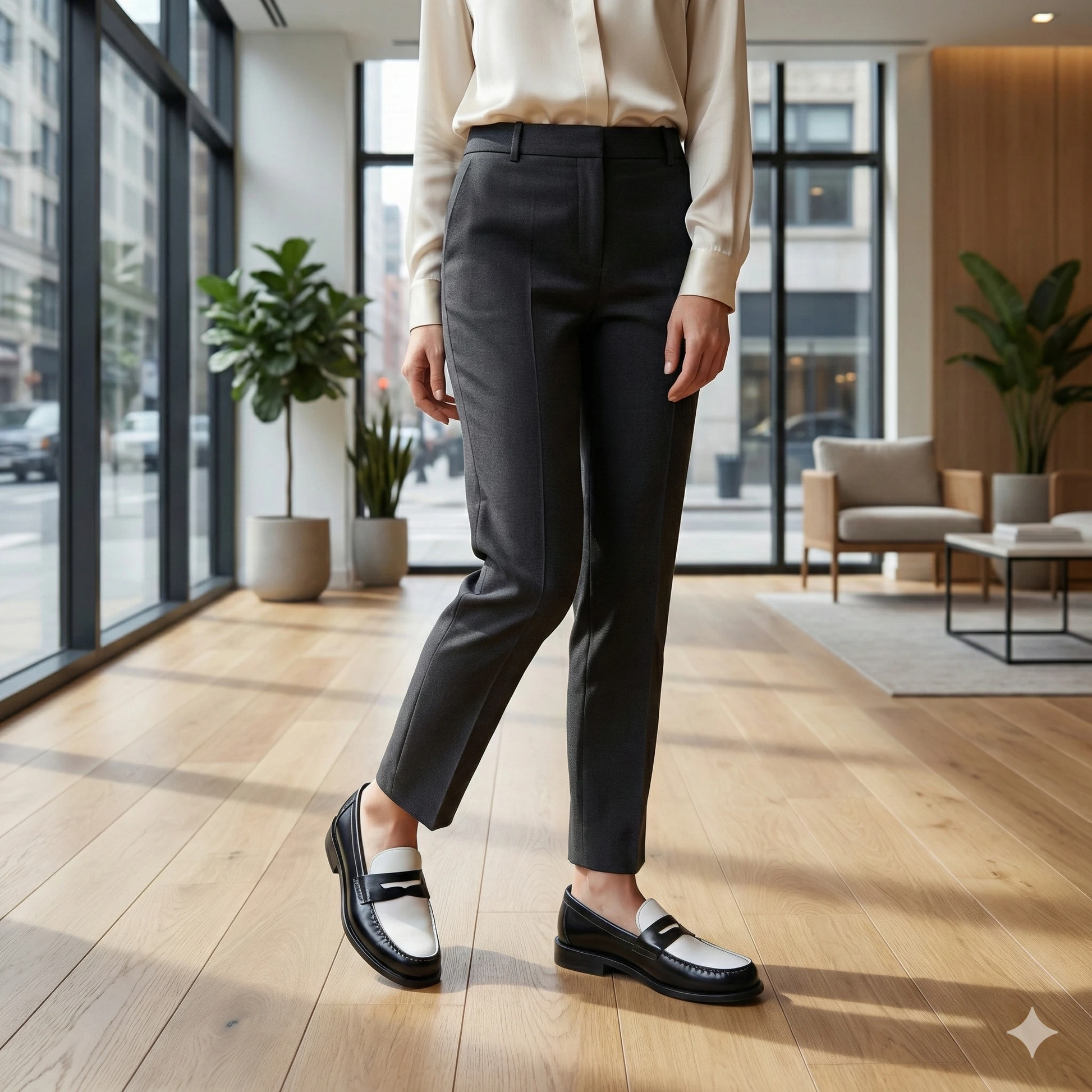 Crafted with high-quality genuine leather, the breathable interior ensures your feet stay fresh, answering the common question: Are these loafers comfortable for all-day wear? Absolutely. The ergonomic low heel provides steady support from morning meetings to evening galas. For those wondering how to clean bicolor leather shoes, we recommend a soft damp cloth for the white vamp and a dedicated black leather cream for the body to maintain that mirror-like shine.