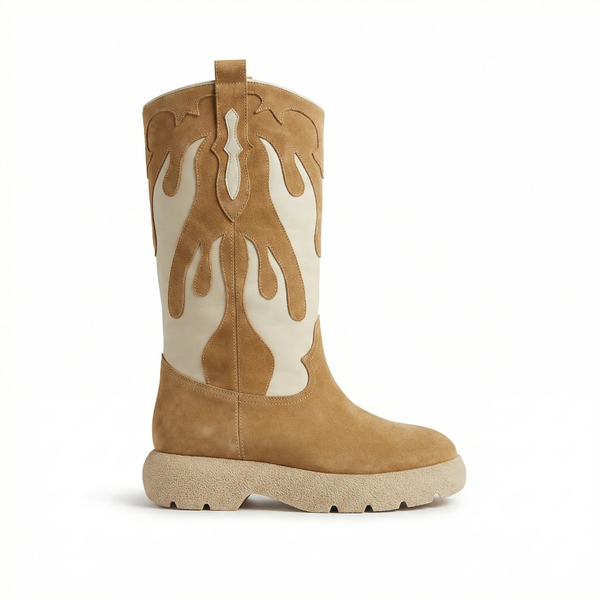 Women's Suede Western Platform Boots - Tan & Cream Urban Cowboy Style